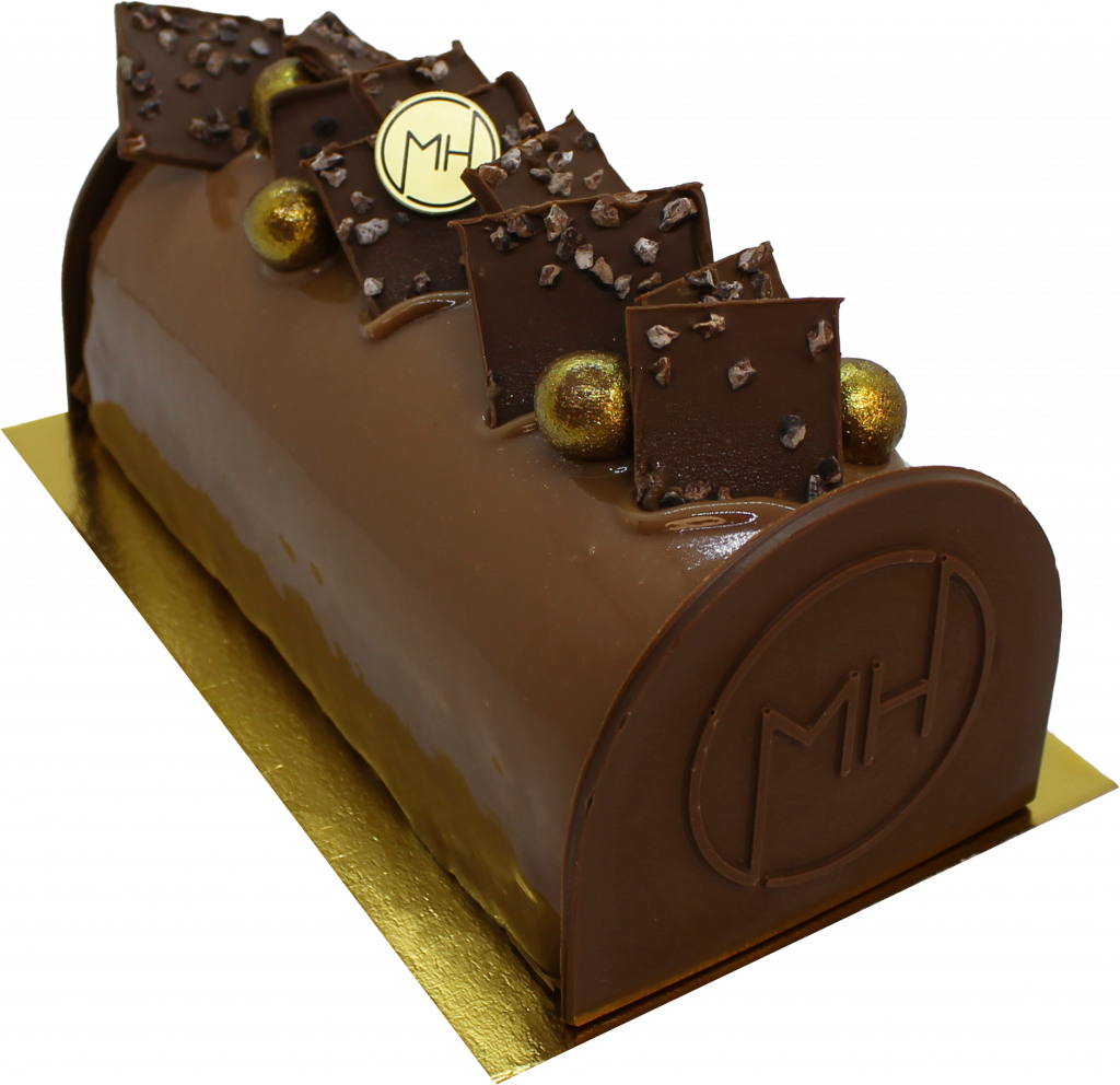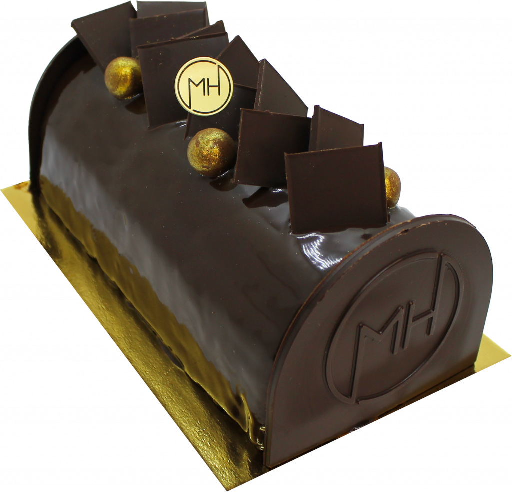 Cette bûche est un pur délice pour les amateurs de chocolat, avec des textures et des intensités qui se marient à merveille. Elle commence par un biscuit Sacher au chocolat moelleux, qui sert de base. Une mousse légère au chocolat blanc adoucit l’ensemble, tandis qu’une mousse au chocolat au lait apporte une douceur fondante. Au cœur, un crémeux intense de chocolat noir ajoute une touche de caractère. Pour finir, une fine feuille de chocolat au lait craquante ajoute une texture complémentaire.