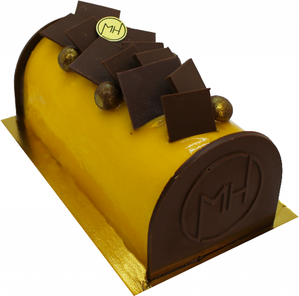 Cette bûche associe des saveurs tropicales et gourmandes : une marmelade fruitée à l’ananas, mangue et passion, déposée sur une dacquoise moelleuse aux amandes, noix de coco et citron vert. Une mousse légère à la vanille enveloppe l’ensemble, équilibrée par un crémeux de chocolat au lait fondant. Le tout repose sur une pâte sablée croquante au citron vert, apportant une touche de fraîcheur.