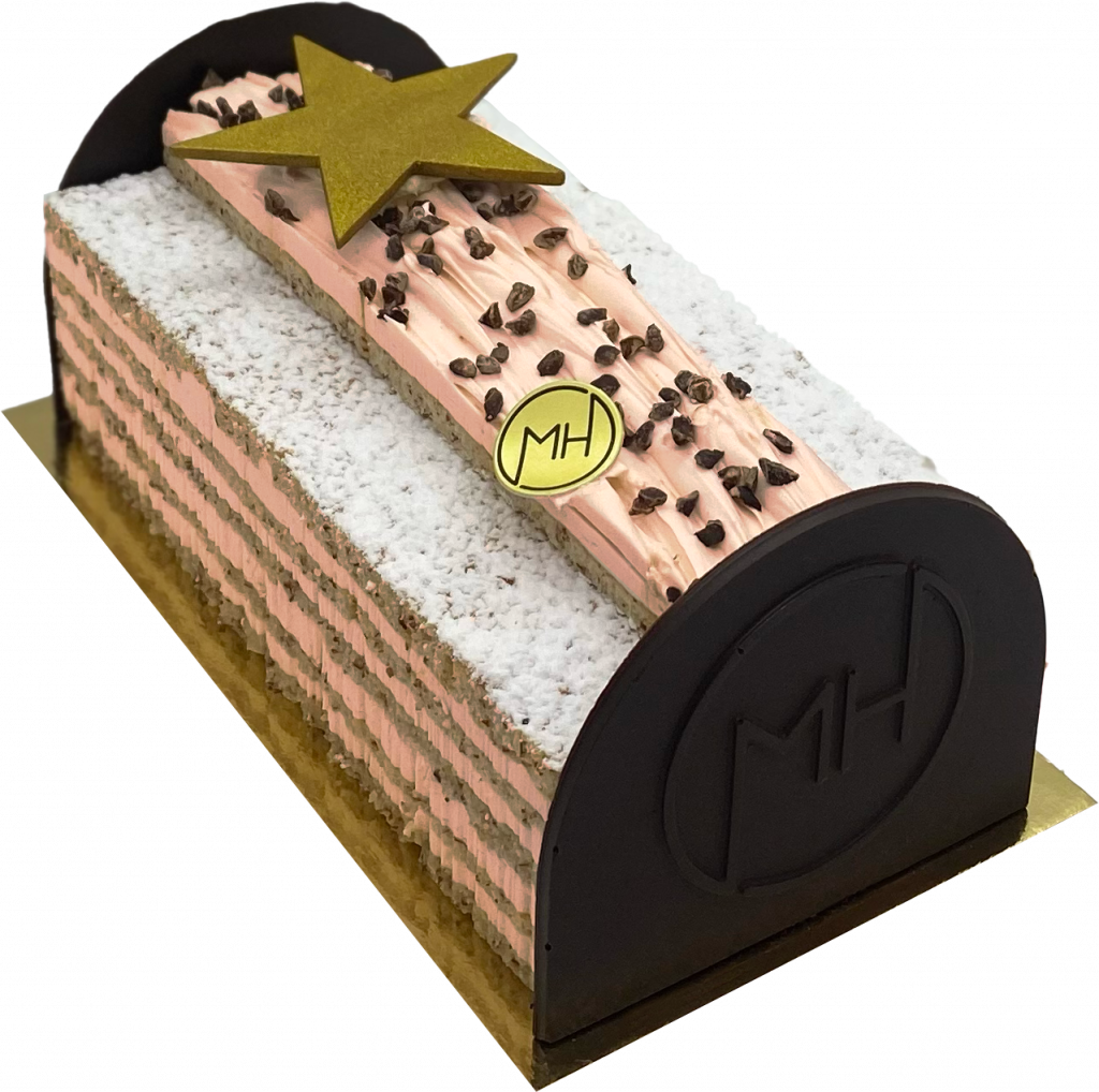 Cette bûche débute par un biscuit moelleux au chocolat, surmonté d’un crémeux au chocolat noir intense et d’une mousse aérienne au chocolat noir. Une fine feuille de chocolat craquant et un croustillant praliné à la feuilletine apportent des notes croquantes et fondantes, offrant un équilibre parfait entre intensité et douceur.